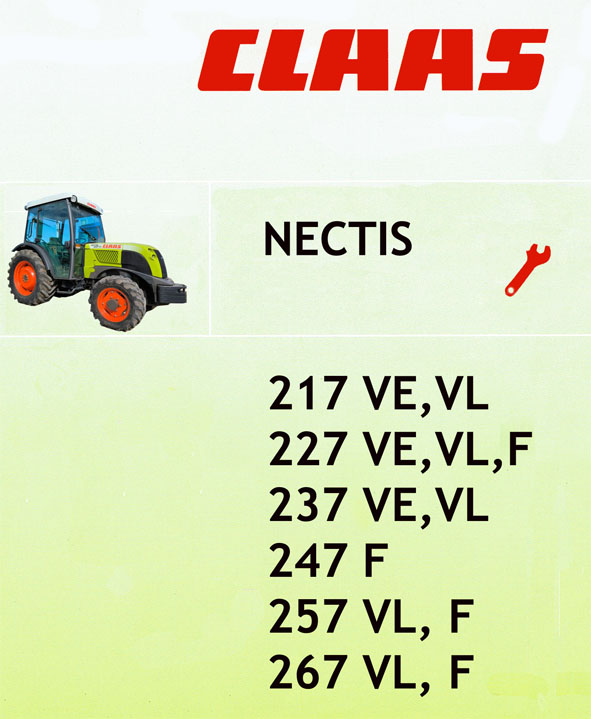 Réf:/class MA Nectis Manuel d'atelier année 2005 des tracteurs CLASS Nectis 217, 227, 237, 245, 257 et 267 versions VE, VL et F (874 pages) Comporte les chapitres: A Moteur injection Alimentation. B Boites de vitesses. C Pont Arrière D Essieu et pont avant. E Relevage Arrière, F Electricité, G Electronique, H Cabine. (Uniquement en Version PDF)