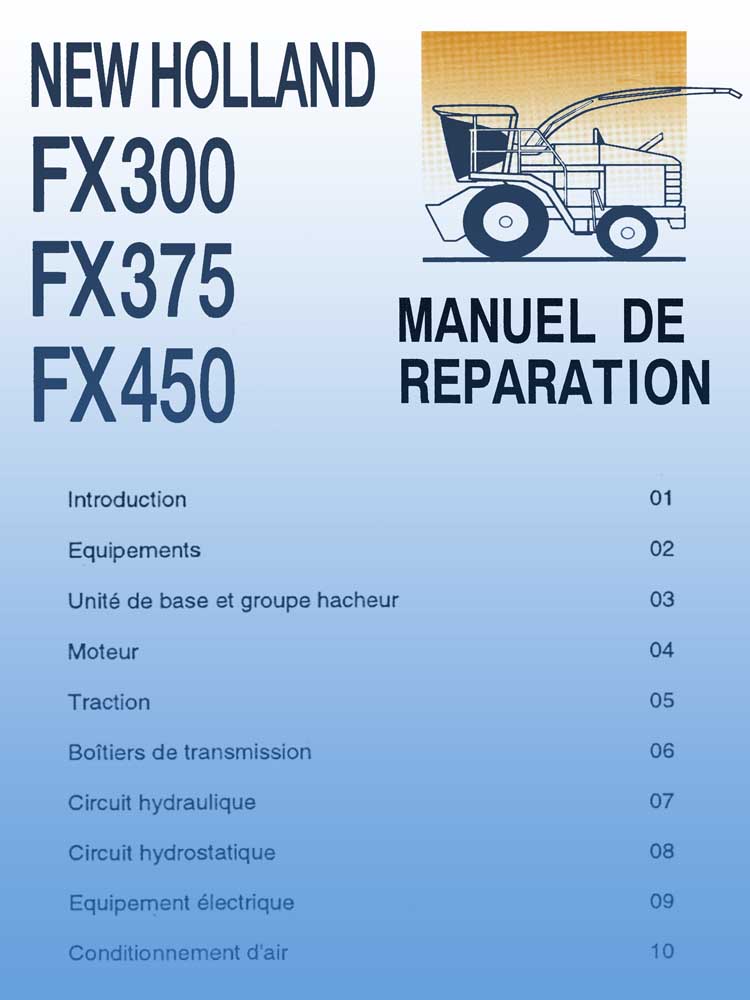 ___________ Réf:/Div.NEW 402 Manuel d'entretien - N° 84019702 de 1997- des Hacheurs New Holland FX300, FX375 et FX450. Fonctionnement, Lubrification, Utilisation, Réglages et entretien, Recherche des incidents, Remisage, Spécifications. (360 pages) ______ Réf:/Div.NEW 403 Manuel de réparation - N° 84019800 de 1995- des Hacheurs New Holland FX300, FX375 et FX450 série 96. Introduction, Equipements, Unité du groupe hacheur, Moteur, Traction, Boitier de transmission, Circuits hydraulique, Circuit hydrostatiques, Equipement électrique et conditionnement d'aire. (602 pages)