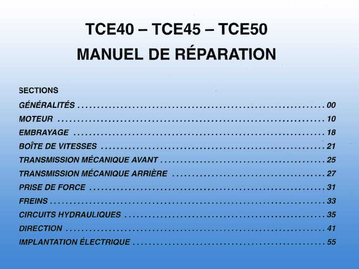 Manuel d'entretien - N° 603 64 782 00 de novembre 2005 - des tracteurs New Holland  de types TCE40, TCE45, TCE50 et TCE55. Informations générales et sécurité, commandes, instruments et fonctionnement, utilisation, lubrification et entretien, recherche de pannes, remisage du véhicule, accessoires, spécifications. (160 pages prix 45 €uros)