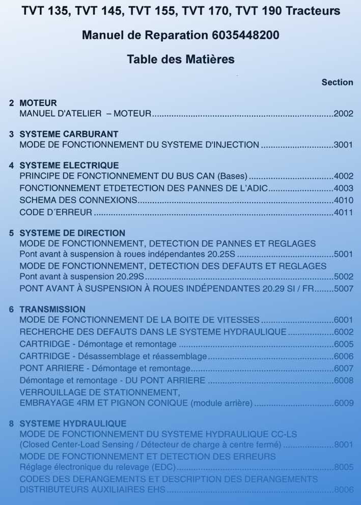 ___________ Réf New entretien TVT 135 à TVT190 Manuel d'entretien - N° 603 69 452 00 de novembre 2004 - des tracteurs New Holland de types TVT135, TVT145, TVT155, TVT170 et TVT190. Informations générales et sécurité, commandes, instruments et fonctionnement, utilisation, lubrification et entretien, recherche de pannes, remisage du véhicule, accessoires, spécifications. (250 pages) ___________ Réf New Atelier TVT 135 à TVT190 Manuel de Réparation N° 603 544 82 00 de 2004 des tracteurs New Holland de types TVT135, TVT145, TVT155, TVT170 et TVT190. (1780 pages) Valable également pour les tracteurs Case CVX