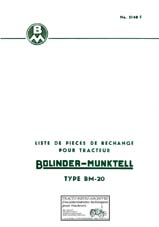 Réf:/ Bolind 005 Catalogue de pièces de rechanges - N° 5148F de 1950 - pour tracteur BM 20. Très beau document ou est répertorié en images toutes les pièces détachées ainsi que la nomenclature s'y reportant. (51 pages) ____________ Réf:/ Bolind 010 Manuel d'instructions - N° 5105F de 1937 - pour tracteur BM 25. (27pages) ____________