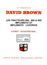 Livret d'entretien - N° DBT 496F de 1963 des tracteurs David Brown types 990, 880 et 850 Implematic et Implematic Livedrive. Séries Livedrive : VAD4 47A, VAD3A, VAD2C40 et VAD2C36. Séries sans Livedrive : VAD4 47B, VAD3B, VAD2D40 et VAD2C36. Equipés des moteurs AD4/47, AD4/40, et AD4/36. (48 pages) ______