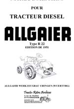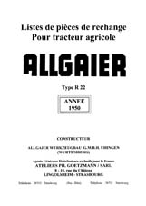 Ref Allga 005 Notice d'instruction de 1951, pour le tracteur Allgaier R22 Bouillotte. Avec schéma de graissage. (21 pages) ___________ ![]() Ref Allga 010 Liste de pièces de rechange N? 2 de 1952, pour le tracteur Allgaier R22 Bouillotte ronde, en français. Document ou sont répertoriées en planches toutes les pièces détachées en planches, les références, les vis les roues tous les éléments qui composent le tracteur, y compris le moteur. (50 pages) ___________ ![]() Ref Allga 010 Bis Liste de pieces de rechange N? 2 de 1950, pour le tracteur Allgaier R22 Bouillotte carrée année 1950 en français . (42 pages) ___________
