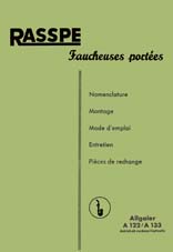 Ref Allga 001bis en allemand Notice d'entretien et de montage de la faucheuse latérale ainsi que catalogue de pièces de rechange de 1956 des faucheuses portées Rasspe de adaptable sur les tracteurs Allgaier A122 a partir de la machine n°2489 et Allgaier A133. Document en allemand avec petit supplément en français (4 pages) sur le dispositif de relevage a main Rasspe pour faucheuse port? adaptable au petit modèle Junior. (16 pages) ___________