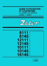 Manuel d'instructions de service et carnet de service après vente N° 1/84 des tracteurs Zetor types: 8111, 8145, 12111, 12145, 10111, 10145 et 16145, avec schémas de graissage et électrique. (125 pages)